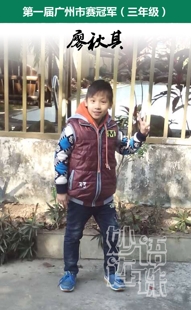 廖秋其选手来自广州市就读于萝岗区九龙第二小学,三年级,第一届妙语连珠成语电视大赛广州市决赛获得三年级组冠军!