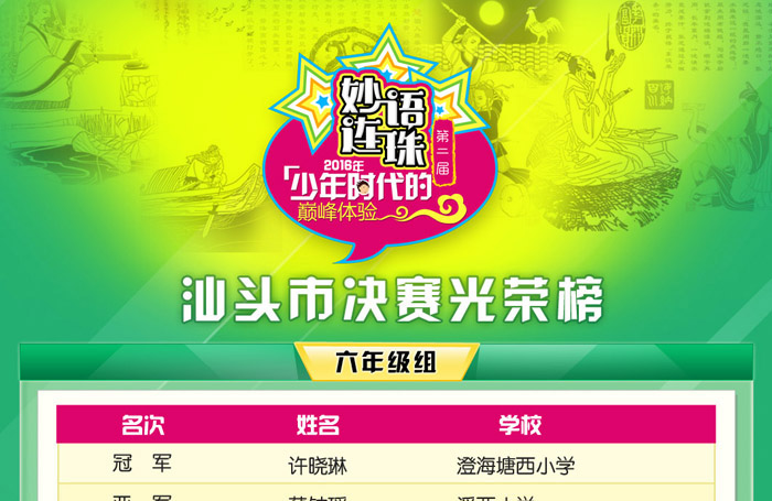 为了让孩子们走近成语,激发孩子学习成语的热情, 从6月开始,全国最大规模的小学语文类比赛 “妙语连珠”成语电视大赛的城市决赛陆续在全国...