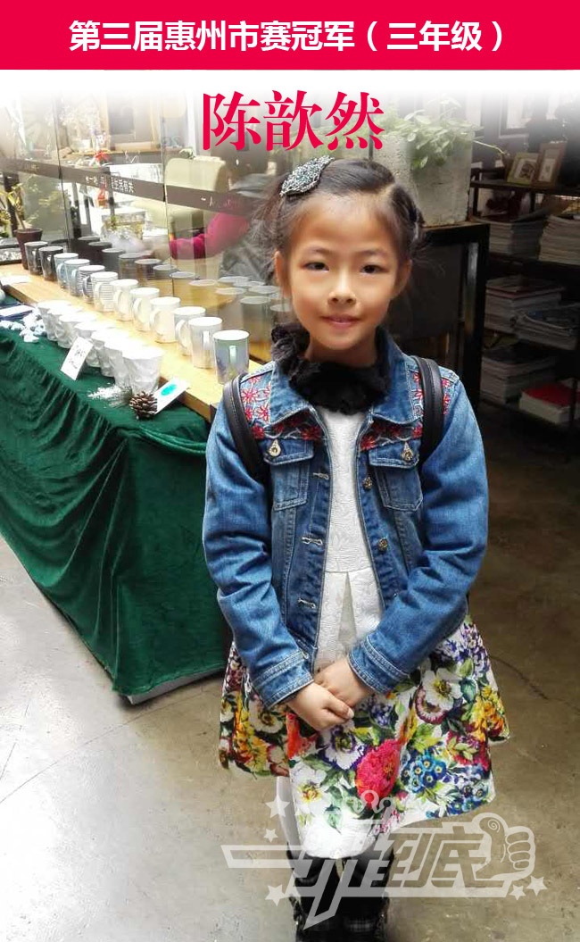 陈歆然选手来自惠州惠城区就读于惠州市李瑞麟小学,三年级,第三届一拼到底英语电视大赛惠州市决赛获得三年级组冠军!