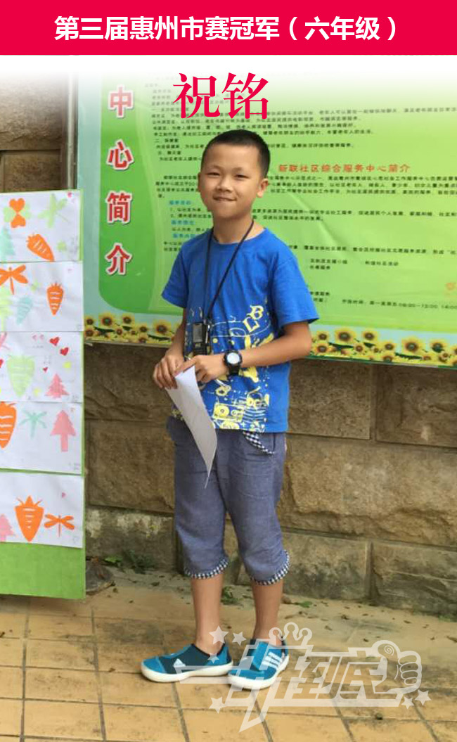 祝铭选手来自惠州惠城区就读于惠州市第十一小学,六年级,第三届一拼到底英语电视大赛惠州市决赛获得六年级组冠军!