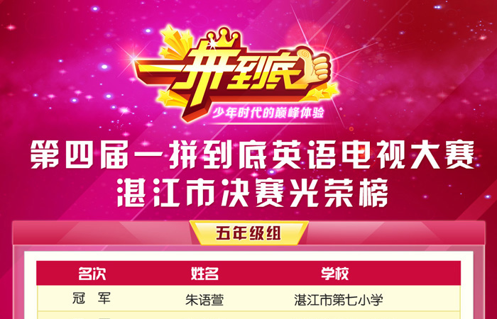 为了让孩子们能更好的参加“一拼到底”英语电视大赛,组委会特安排为各赛区选手举行选手见面会暨模拟赛活动,活动以短通知为准...